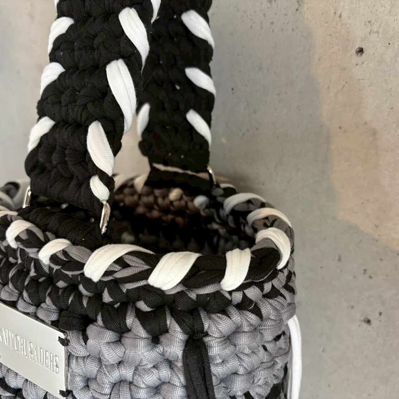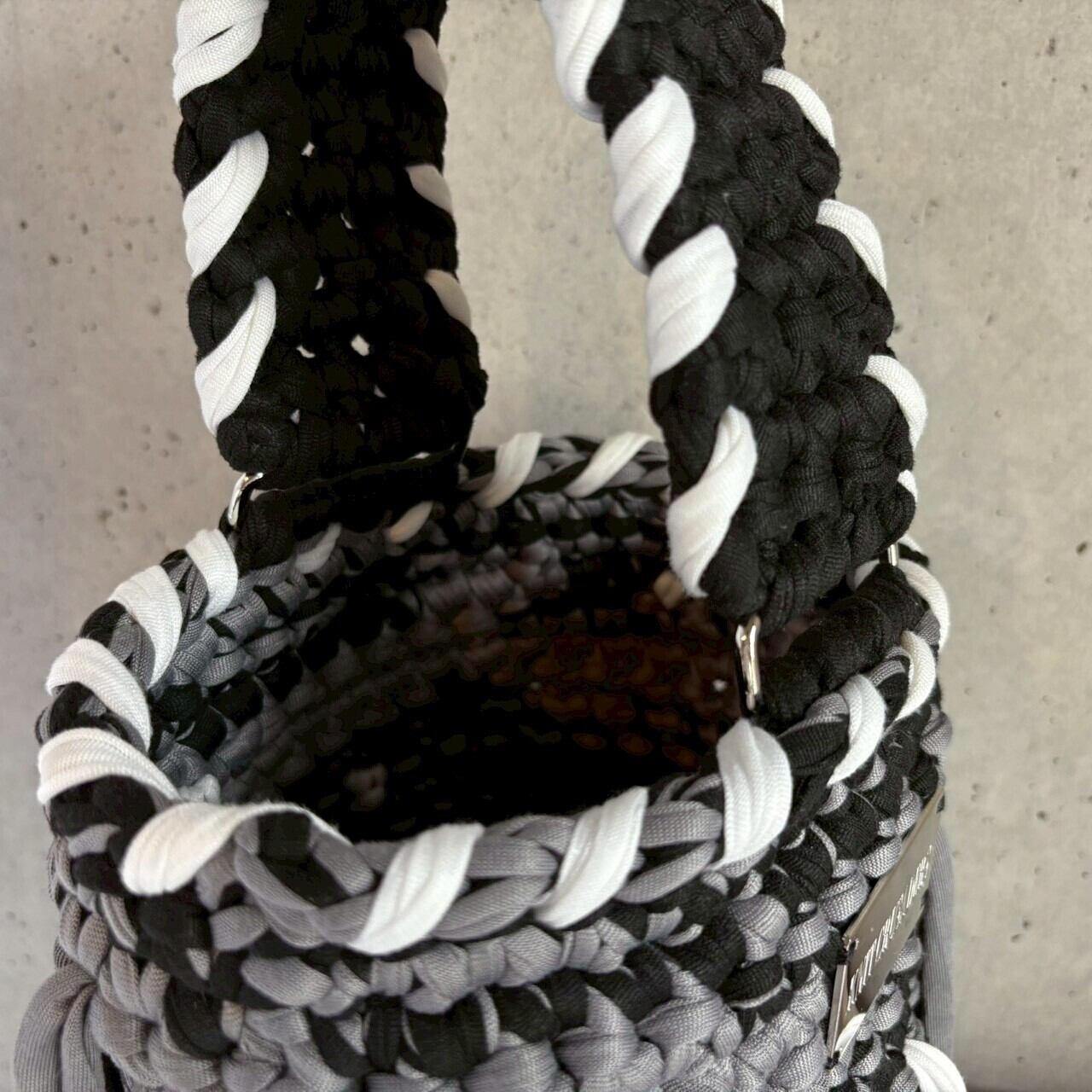 大胆な編み模様が目を惹く、バケットバッグ。極太のカットソーヤーンを使用し、存在感のある編み地に仕上げました。ホワイトで入れたハンドステッチ風のラインがアクセントとなり、コーディネートに抜け感をプラスしてくれます。
