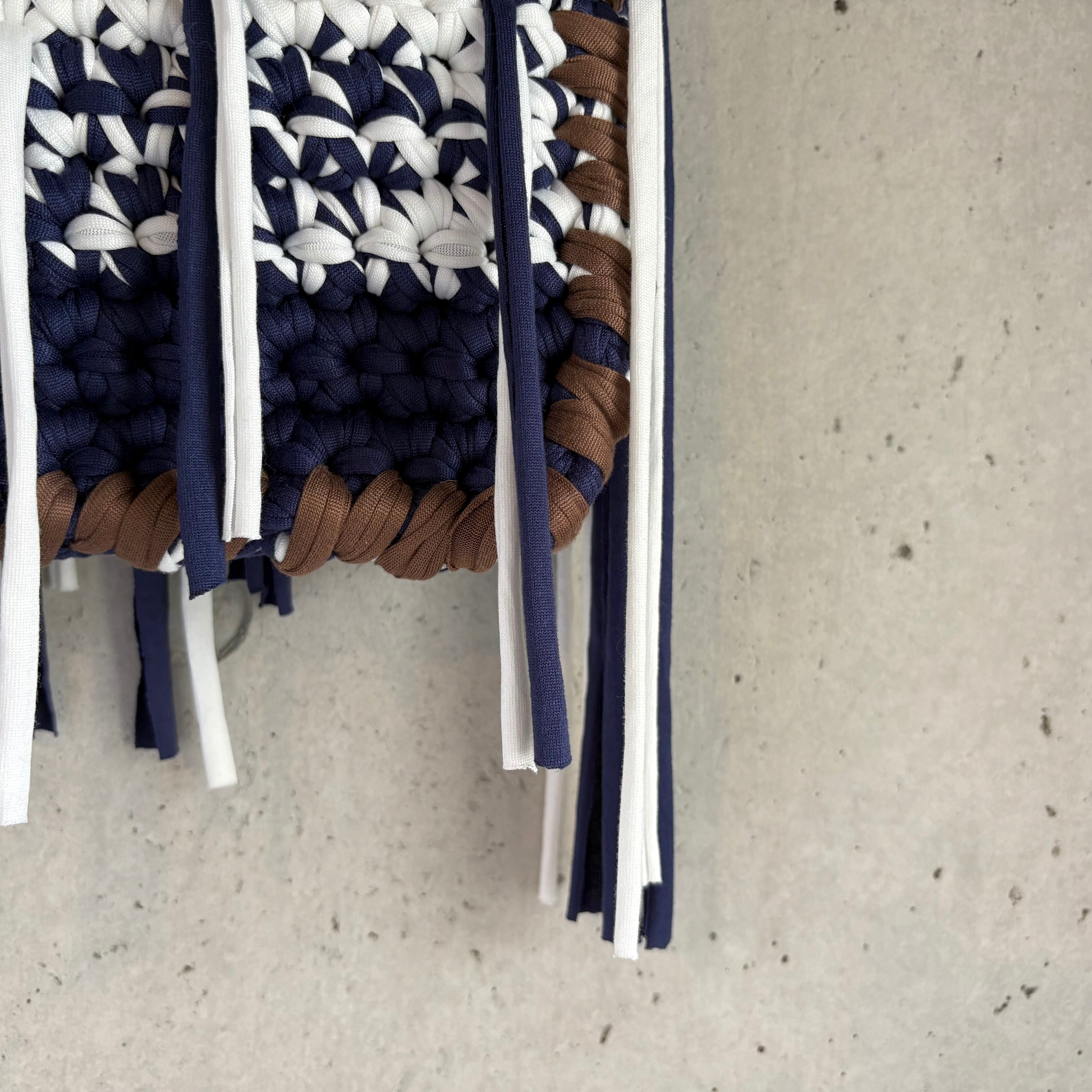 ネイビーとホワイトのコントラストが海辺の風景を思わせ、揺れるフリンジが潮風のような遊び心を演出。大人のカジュアルスタイルにも自然に馴染む、爽やかで洗練されたデザインです。